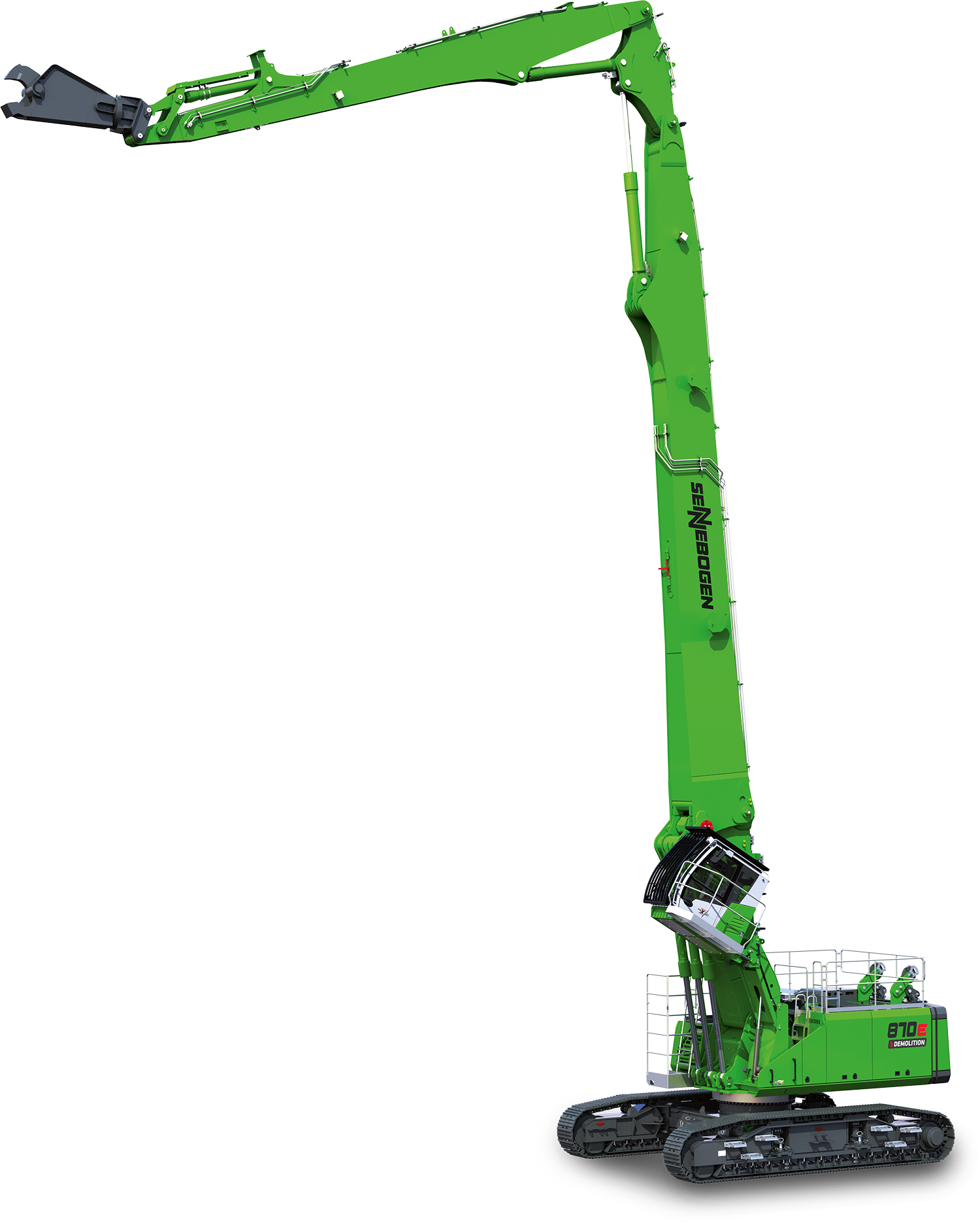 With a long front and high reach, SENNEBOGEN demolition machine can tear down a building between 9 to 10 stories tall with ease and safety with precise and vibration-free demolition attachment, a shear cutter and pinpoint accuracy grab that can bring debris back to ground level safely.